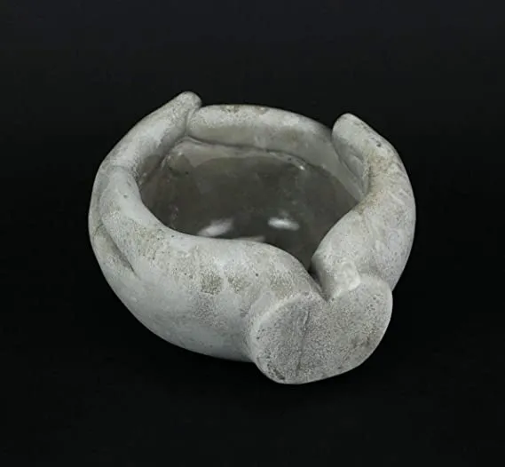 Cast into the shape of a pair of cupped hands in a giving gesture, this wonderful planter is a stylish modern addition you can place anywhere in or around your home. The cupped hands create an open vessel in which you can store your cell phone, remotes, keys and more, or use it as a plant pot for succulents, vivid greenery, herbs or small flowers. Made of concrete in a natural soft grey finish, it can be displayed both indoors and outdoors. This 7.5 inch long, 7 inch wide, 3.75 inch high pot can also be used as a candle holder for a centerpiece or coffee table decoration. Or place bird seed inside for your feathered friends. It is a handy decor piece with many uses that brings an artistic touch anywhere.