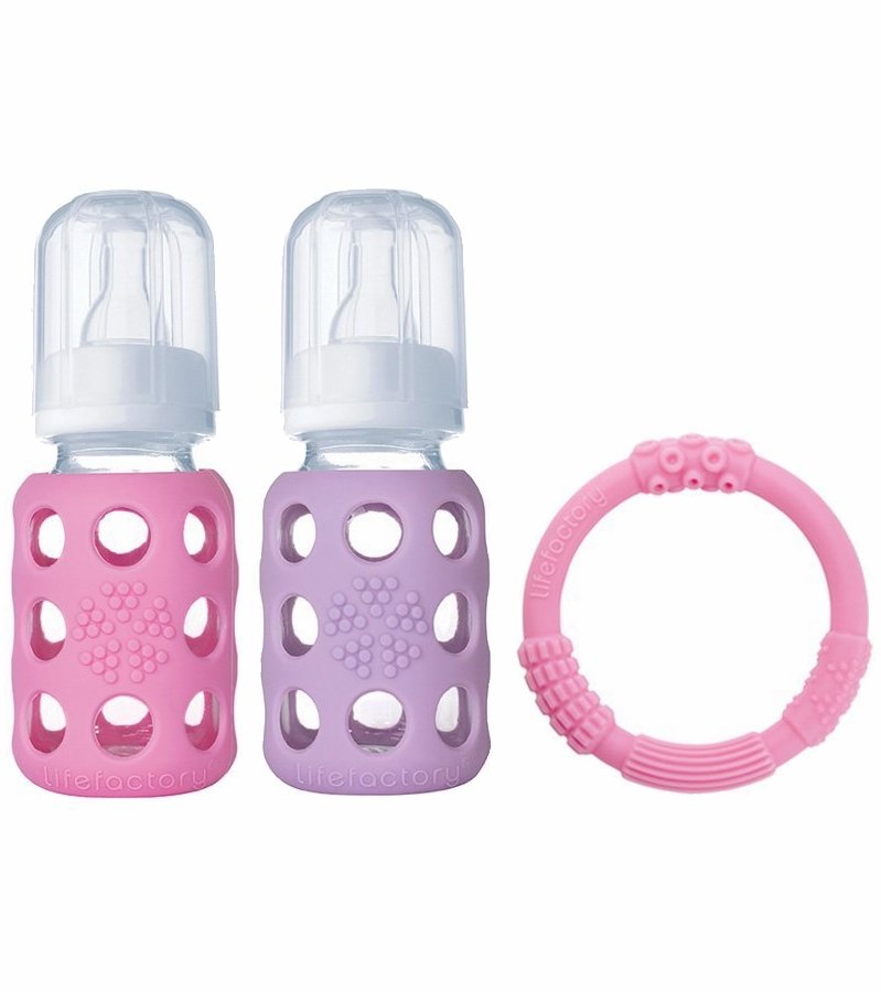 - Includes: 1 Pink 4 oz bottle; 1 Lilac 4 oz bottle; 1 Pink teether